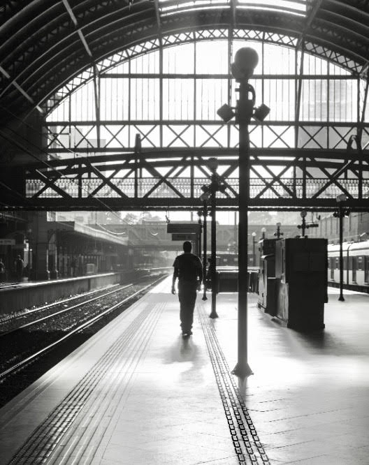 Ao centro, uma figura humana avança. Caminha sem nome, sem rosto, quase dissolvida na claridade. É alguém — e é todos. Um corpo em trânsito, símbolo de uma travessia sem nome, seguindo o caminho antes do caminho. Não atravessa apenas uma plataforma, mas um estado de existência. A solidão ali não pesa; ela se revela, discreta, como a solidão compartilhada de todos os que passam.