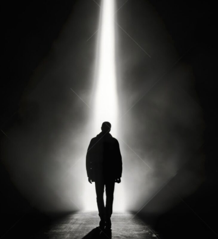 Seus passos ecoam por corredores de sombra, entre medos apocalípticos e a priorização de banalidades cotidianas, enquanto a essência humana se esvai num cenário que entretém, distrai e reduz o nível da consciência. A luz interior, frágil, se desfaz como chama exposta ao vento.