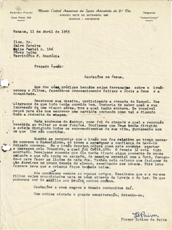 Written in Manaus by Pastor Itamar Sabino DePaiva, then associated with the Central Amazon Mission of the Seventh-day Adventist Church, the correspondence was sent to Captain Jairo Saraiva, a resident of Porto Velho — then the Federal Territory of Rondônia — where Pastor Itamar served as the city’s first Seventh-day Adventist pastor.